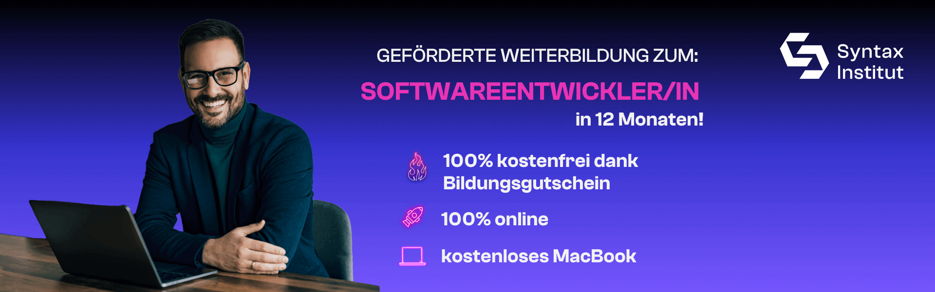 Das Syntax Institut ist ein AZAV-zertifizierter Bildungsträger, der sich auf die App- und Web-Entwicklung spezialisiert hat. In unseren praxisnahen Kursen vermitteln erfahrene Entwickler/innen alles, was du brauchst, um erfolgreich in der IT-Branche durchzustarten. Wir begleiten unsere Teilnehmenden individuell und mit großem Engagement auf ihrem Weg – stets mit dem Ziel, lebenslanges Lernen und berufliche Weiterentwicklung zu fördern.